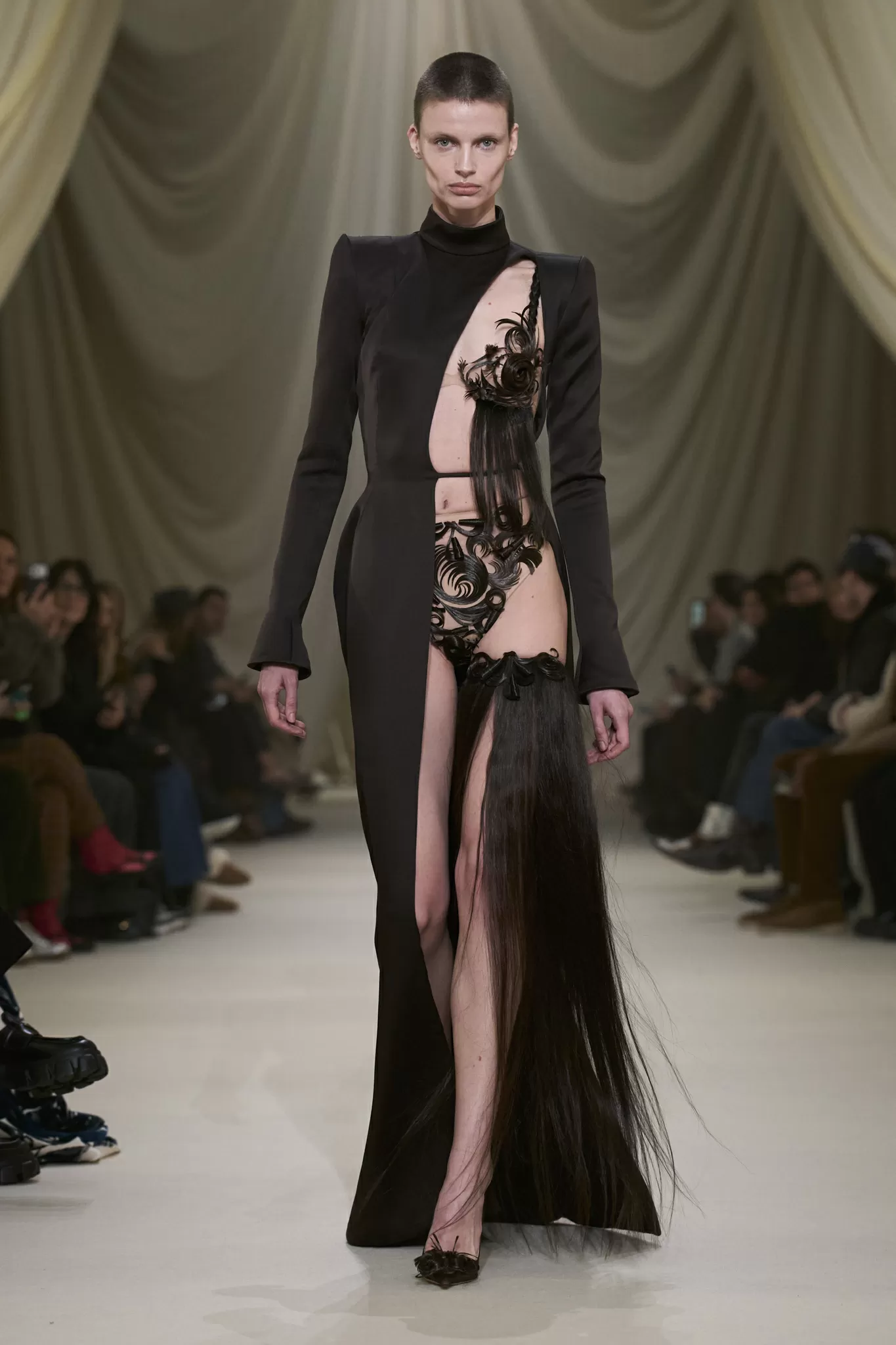 The Victorian era, known for its strict social norms and elaborate fashion, has always been a source of fascination for designers. And this collection is no exception. The designer has taken elements from this era and transformed them into something truly extraordinary. The use of hair jewelry, which was a popular trend during the Victorian era, is a bold and unexpected choice. But it is this unexpectedness that makes the collection so alluring.